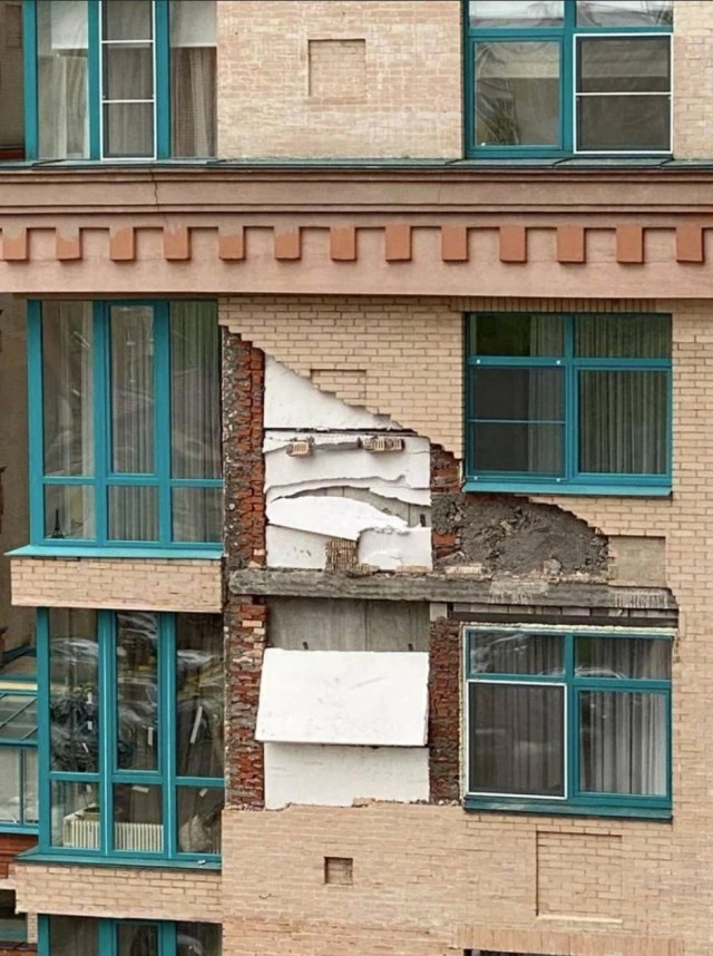 Жители элитного московского ЖК «Алые паруса» остались в шоке от картины ремонта фасада своего здания. Сейчас управляющая компания ремонтирует облицовку здания.