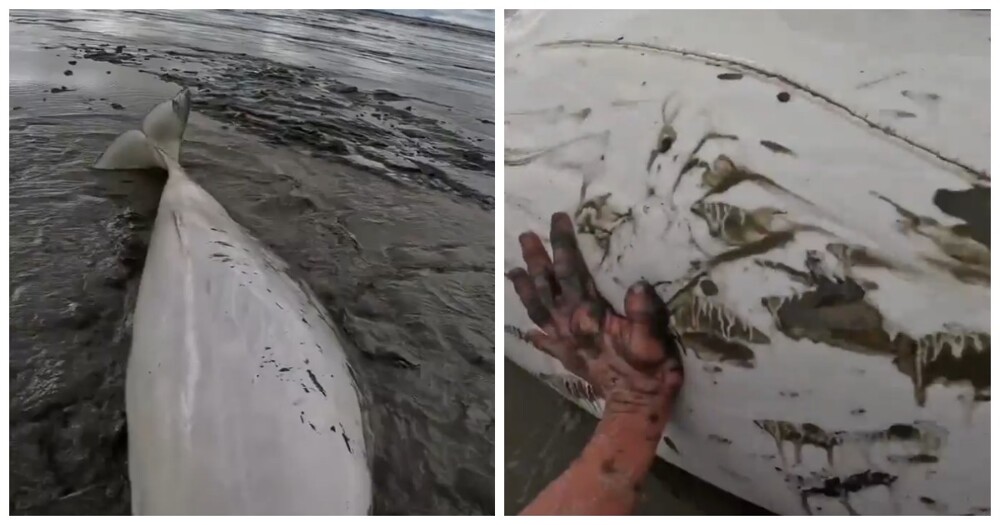 Мужчины спасли выброшенную на мель белуху