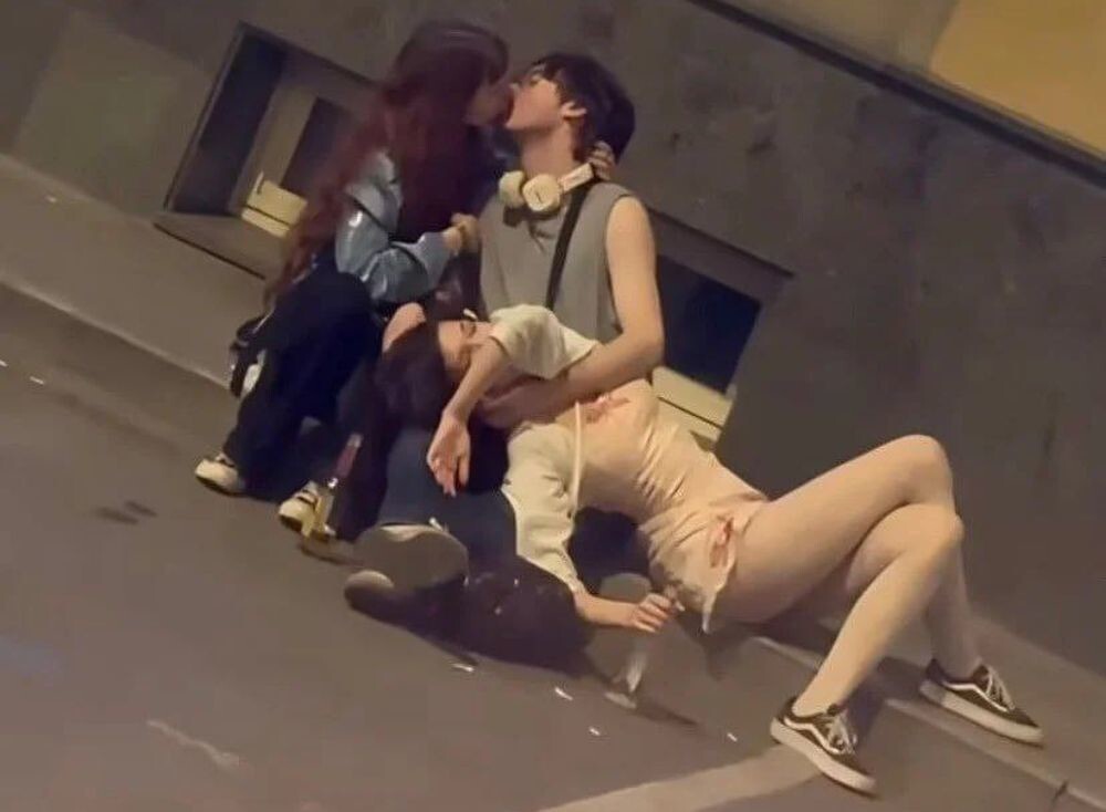 В социальных сетях набрала популярность фотография троицы из Токио. На ней парень и девушка целуются на улице, пока их пьяная подруга спит рядом. Кадр превратился в мем.