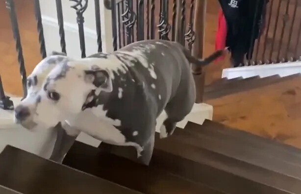 Пёс решил подняться по лестнице ко своей хозяйке. Однако сделать это оказалось не так уж и просто. На одной из ступенек лежал котёнок и не хотел его пропускать.