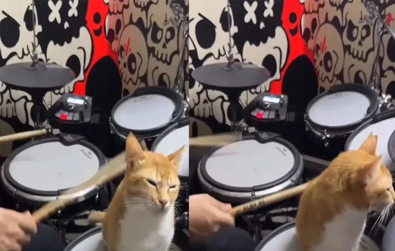 Кот добровольно заменил хозяину один из барабанов и заодно получил сеанс массажа.