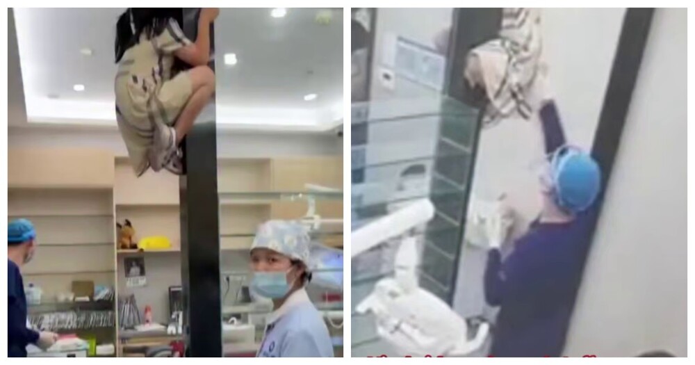 Китайская девочка настолько сильно боялась процедур в стоматологическом кабинете, что решила забраться повыше. В итоге сотрудникам клиники пришлось уговаривать ребенка спуститься.