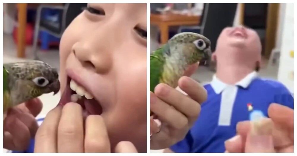 Попугай помог школьнику избавиться от молочного зуба. Женщина поднесла пернатого ко рту ребёнка и он схватил шаткий зуб.