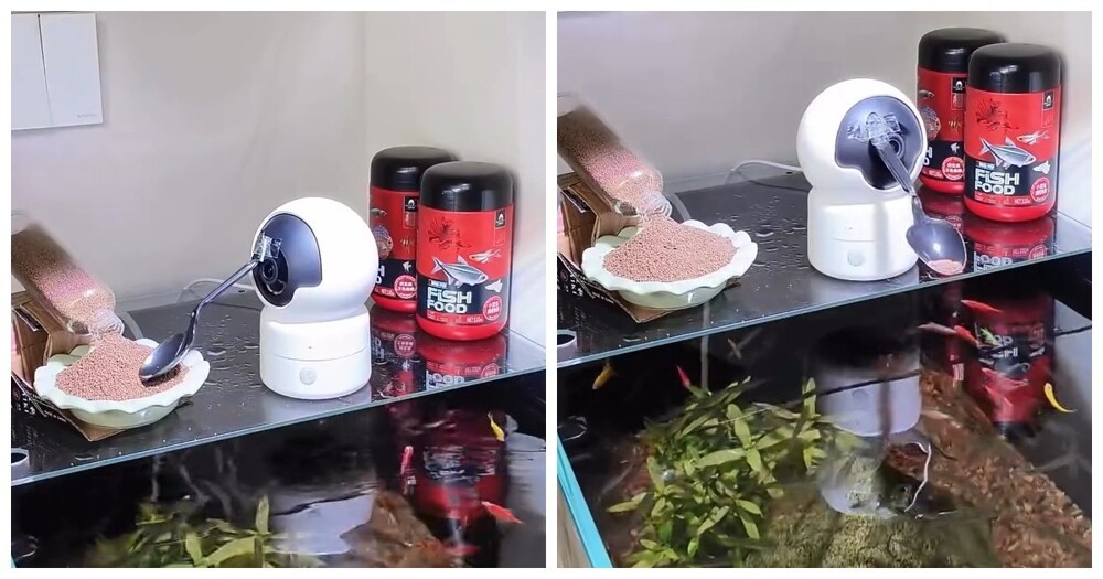 Смекалистый парень нашел крайне необычное применение домашней камере наблюдения, превратив ее в аппарат для удаленной кормёжки рыб.