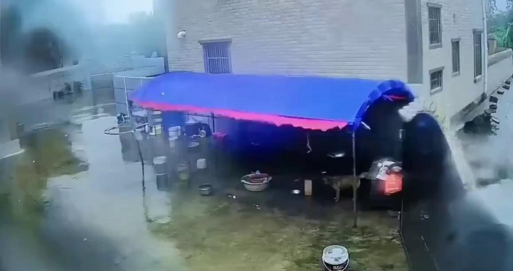 В Китае сильный ветер поднял тент с привязанными к нему собаками. Один из четвероногих друзей смог спастись самостоятельно, а другому потребовалась помощь человека.