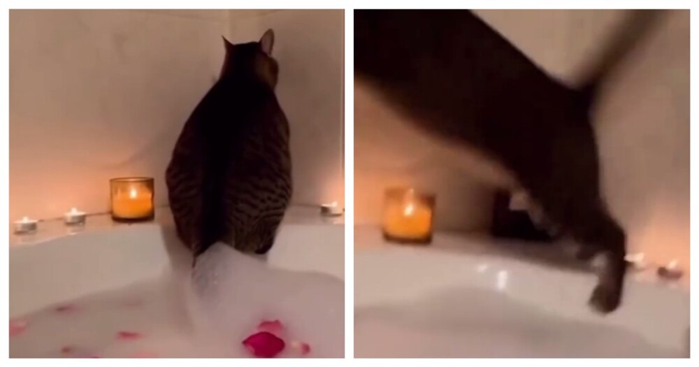 Кот навестил хозяйку, которая принимала ванну с пеной и лепестками цветов. Пушистый друг не стал ограничиваться ролью простого наблюдателя и добавил атмосферы.