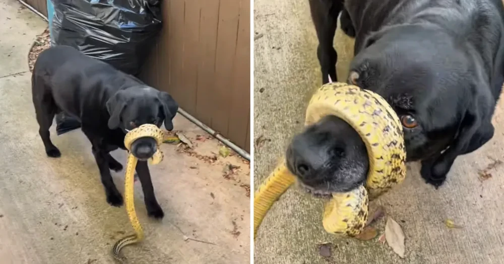 Специалист по отлову змей Брюс Айрленд получил тревожный звонок от владелицы собаки. Женщина сообщила, что ее черный лабрадор, по имени Кейси, имеет на морде обмотанную большую змею. К сообщению она добавила фото, поэтому Айрленд немедленно отправился на место происшествия.