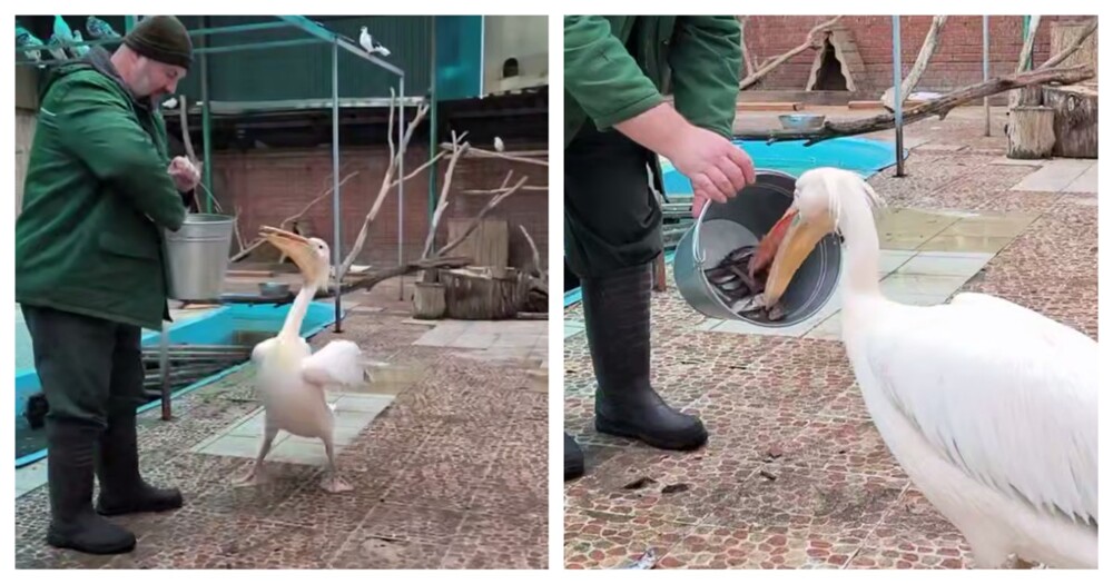 Пеликан Аркадий из Самарского зоопарка лакомится рыбкой.