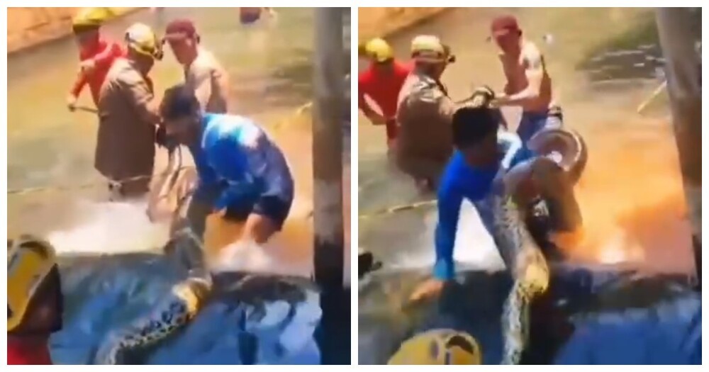Огромная змея пряталась в трещине на бетонных ступенях, ведущих от главного бассейна к барной зоне, пока десятки людей наслаждались отдыхом.