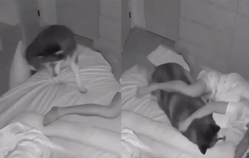 Пёс решил, что лучшее место для сна — кровать хозяина. Питомец утащил у мужчины одну из подушек и лёг вместо неё.