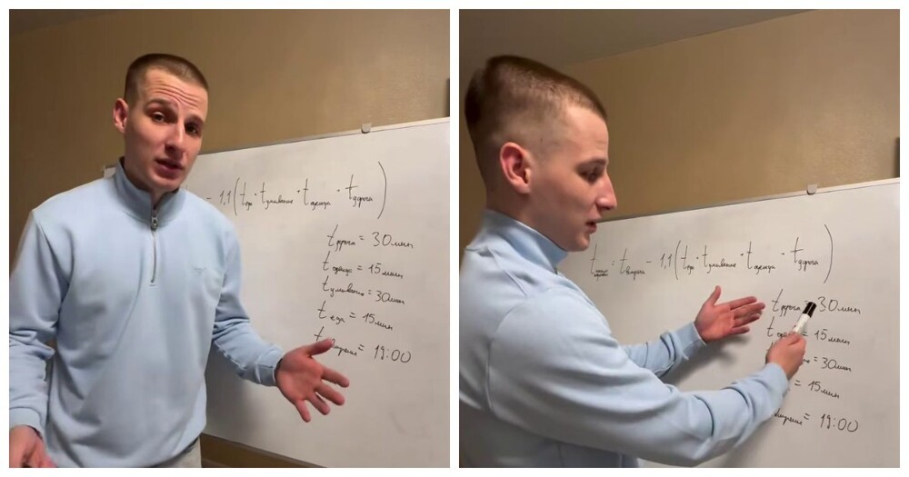 Парень показал шуточную формулу, которая помогает вычислить, насколько вы опоздаете, исходя из привычек, скорости сборов и расстояния до места назначения. Главное — правильно подставить цифры и не забыть, что математика не спасёт, если вы всё равно не вышли вовремя.