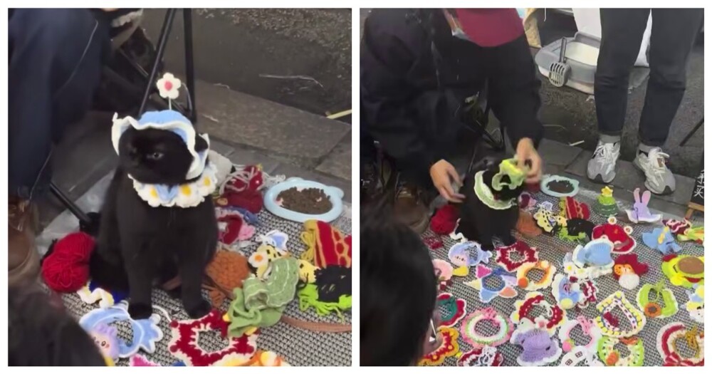 Черная кошка работает моделью одежды и аксессуаров для сородичей. Судя по кадрам она прекрасно справляется со своими рабочими обязанностями.