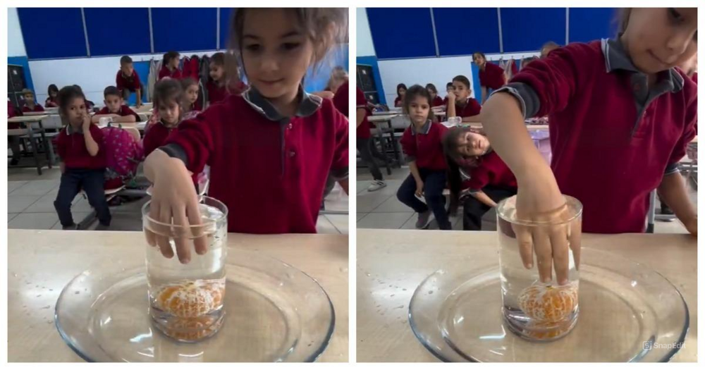 Учитель дал детям задачу: вытащить мандарин из стакана с водой. Казалось бы, ничего сложного. Однако было дополнительное условие. Ученики должны были достать фрукт, не пролив воду из стакана.