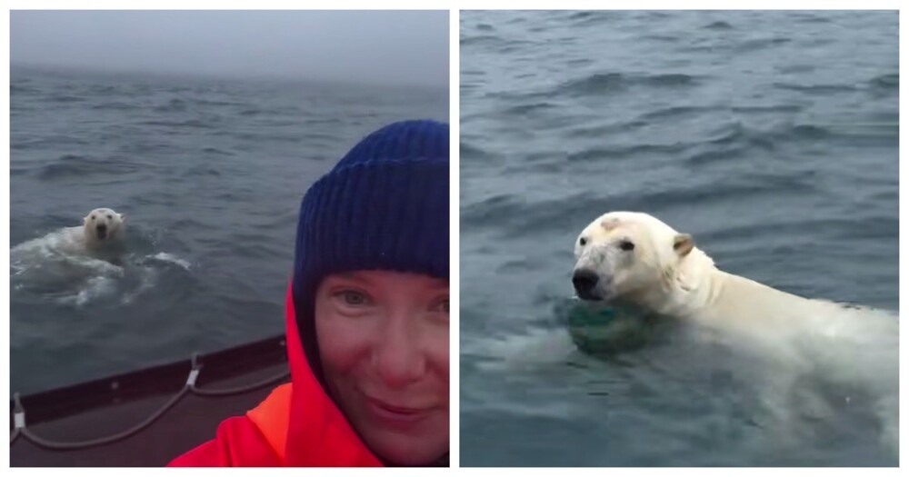 Путешественники отправились посмотреть на птичьи базары, но вместо птиц внимание людей привлёк белый медведь. Хищник проплыл мимо их лодки.