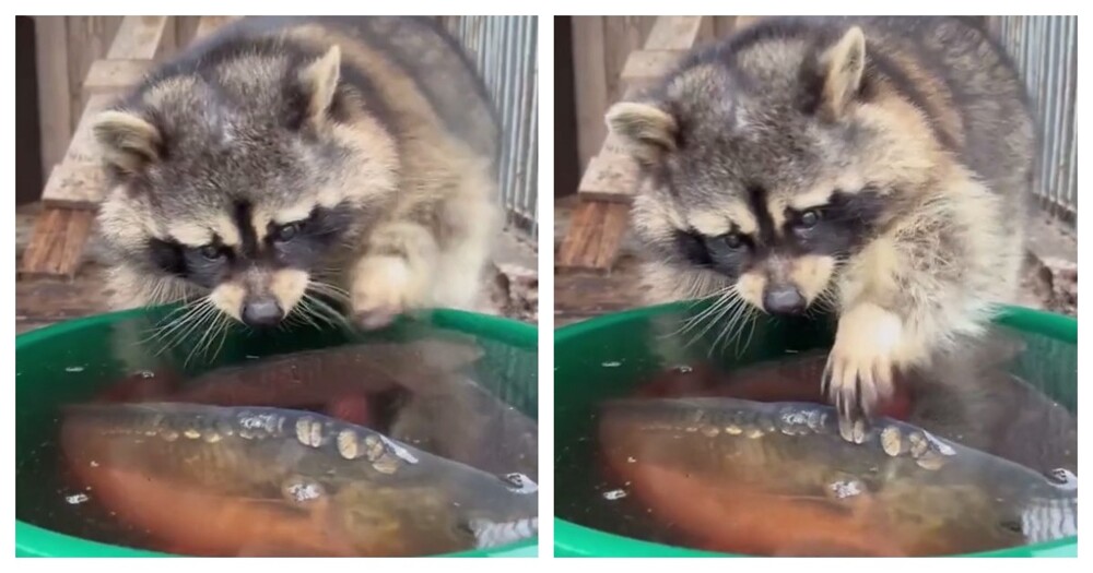 Енот увидел рыбу в тазу и решил её потрогать. У пушистого появилось желание прополоскать рыбу, но он не знал, как это сделать.