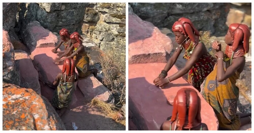 Женщины народности химба в Намибии ежедневно покрывают кожу, волосы и одежду специальной пастой, называемой на местном диалекте "отжиже" - смесью коровьего жира, масла и красной охры из гематита, добываемой в горах Опуво.