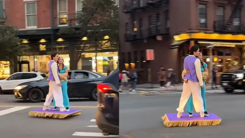 В Нью-Йорке засняли Аладдина и Жасмин, «летящих» по своим делам на ковре-самолете.