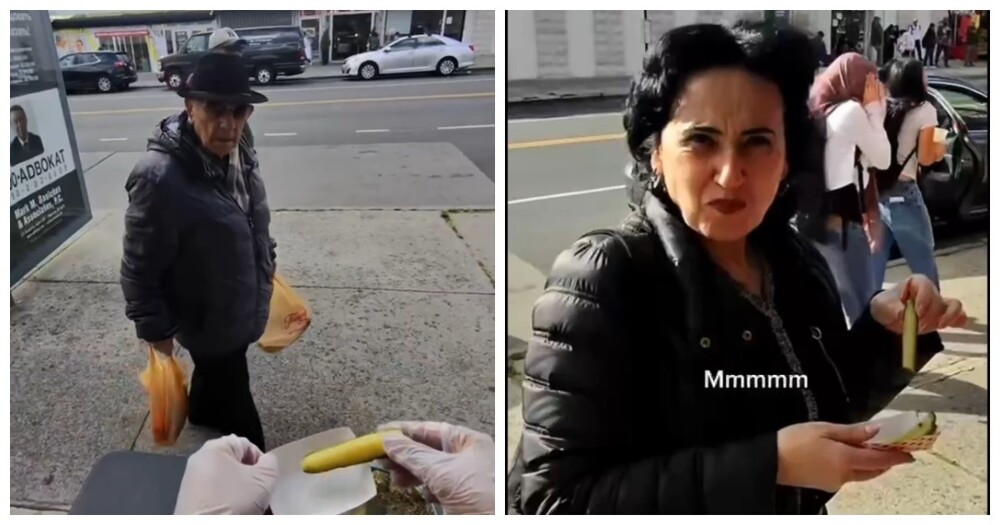 В русском районе Нью-Йорка парень предлагает прохожим бесплатно попробовать свои домашние огурцы. Так он рекламирует собственное производство — банки с маринованными огурцами продаются примерно за 1000 рублей по текущему курсу.