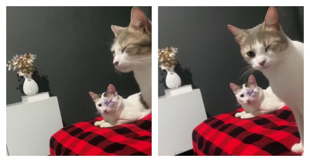 После того как коту сделали операцию на глазу, второй питомец начал ему подражать. Он стал прищуривать глаз.