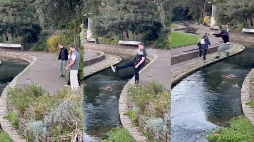 Компания друзей решила устроить испытание — перепрыгнуть узкий ручей в парке. Всё шло по плану, пока один из «спортсменов» не сделал слишком смелый разбег.