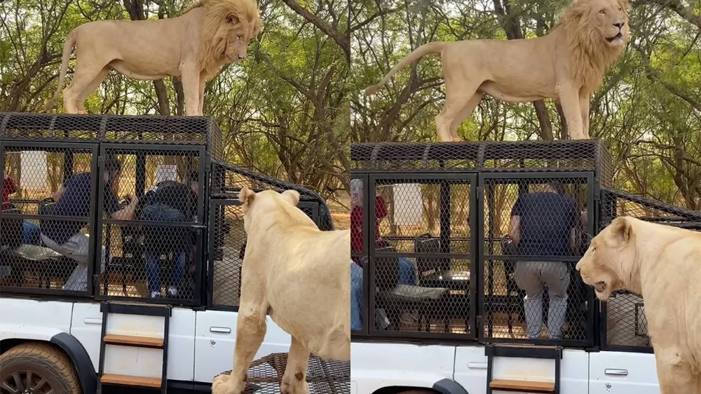 Группа путешественников наблюдала за львами из специального автомобиля. Один из хищников неожиданно поднялся на крышу машины и, устроившись прямо над людьми, метко оставил на них свой «след».