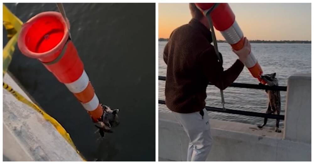 Жители США пришли на помощь тонущему еноту. Зверя вытащили из воды с помощью дорожного конуса.