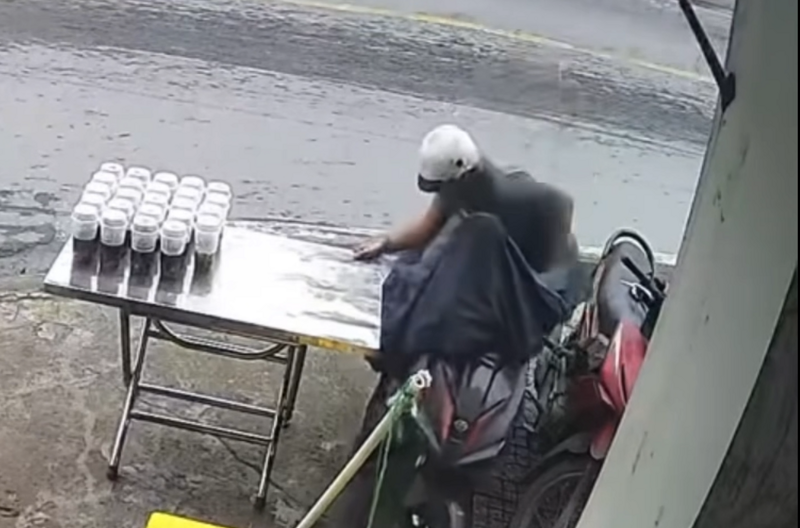 На видео видно, как мужчина пытается вытащить свой припаркованный мотоцикл, но задевает стол с выставленными на продажу стаканчиками чая. В результате весь товар падает на пол, и мини-торговля прерывается.