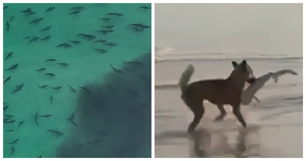 Во время рыбалки на пляже на острове K’gari рыбак заснял необычное событие: дикая собака динго внезапно схватила детёныша акулы прямо из мелководья и унесла на берег.