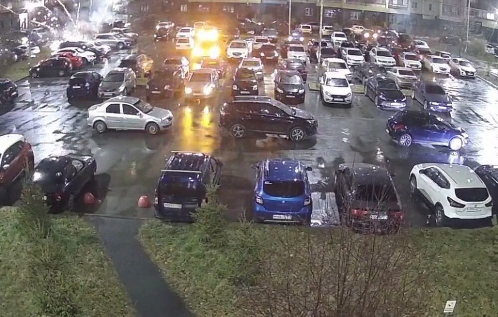 В Челябинске запустили фейерверк на парковке, забитой машинами. Залпы полетели в окна и припаркованные автомобиля.