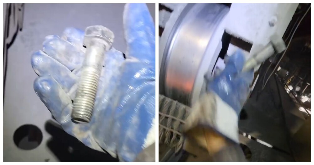 Мужчина проходит вдоль колес мостового крана с большим болтом в руках, сопровождая свои действия весёлыми комментариями.