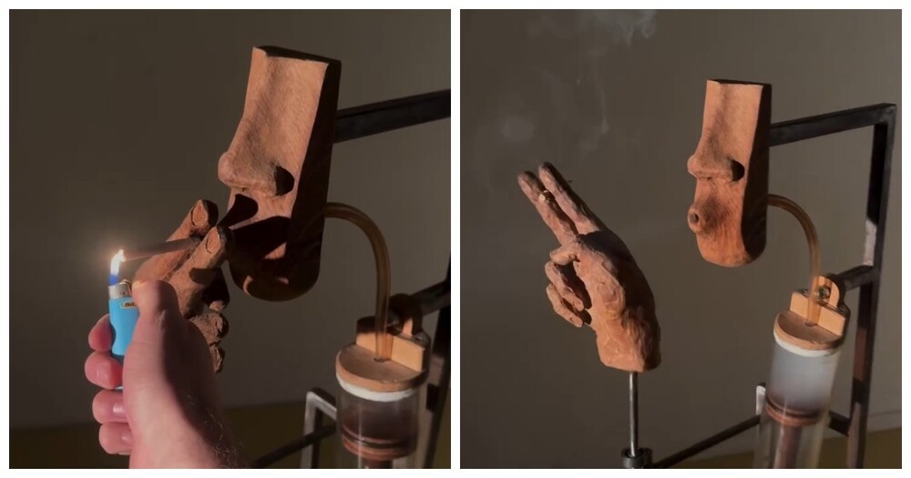 Механическая установка воспроизводит привычку человека курить с помощью синхронизированных движений шестерён и стержней. Воздушный насос действует как лёгкие, втягивая и выталкивая дым через сигарету, создавая иллюзию естественного дыхания.