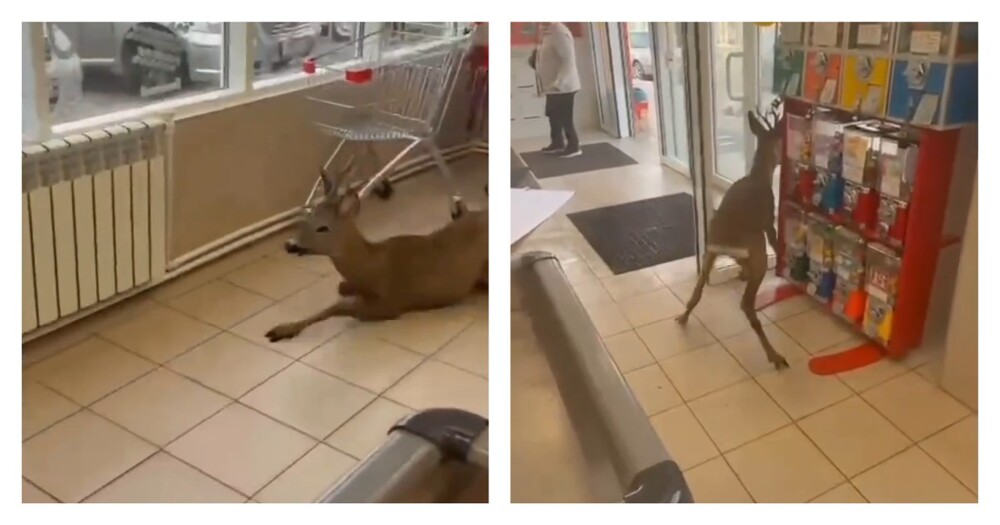 Косуля забежала в супермаркет в селе Лермонтово под Туапсе и устроила небольшой переполох. Животное спотыкалось, падало и металось, пытаясь найти выход.
