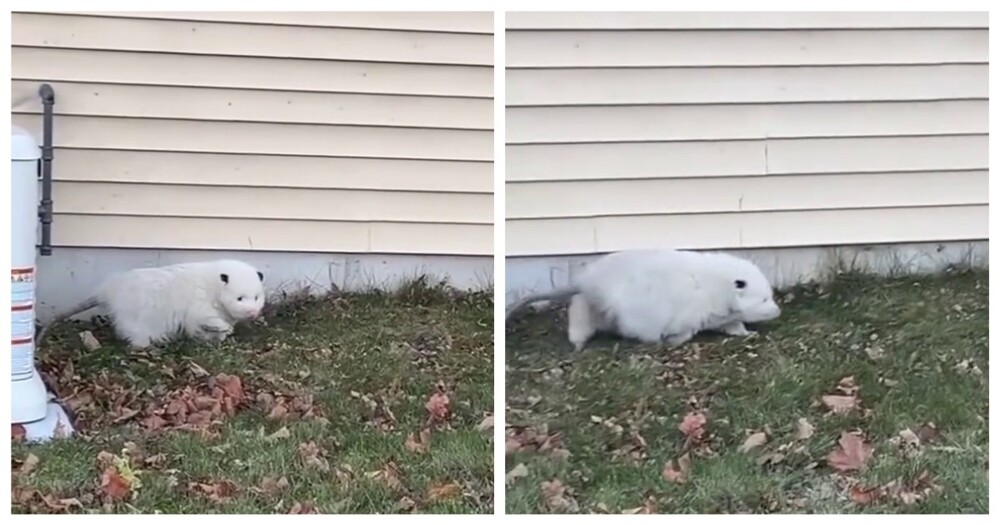 Житель США заснял редкого опоссума-альбиноса, который основательно подготовился к холодам. Пушистый зверь неспешно шёл по своим делам и скрылся в густой траве.