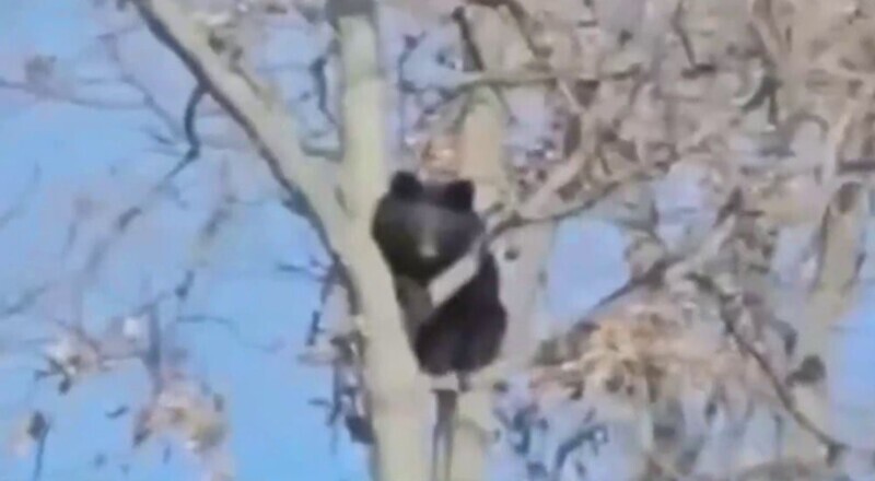 В Приморье медведь залез на дерево и стал наблюдать за рабочими. Косолапый не спускается уже двое суток.