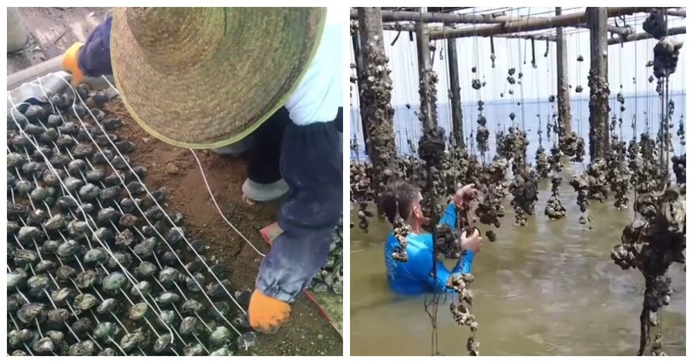Процесс начинается с изготовления прочных цементных дисков, которые нанизывают на толстые канаты и опускают в море. На их шероховатой поверхности в тёплый сезон естественно закрепляются личинки устриц.