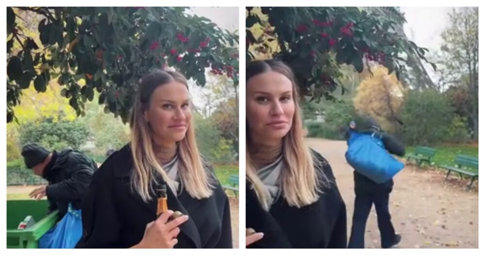 На туристическое видео попал рыцарь ордена бутыльеров, ищущий бутылки и ценные вещи в мусорных контейнерах Парижа.