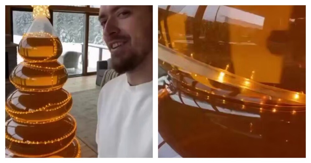 Парень похвастался необычной ёлкой, установленной в его доме. Она представляет собой стеклянный сосуд для пенного напитка с краном для розлива.