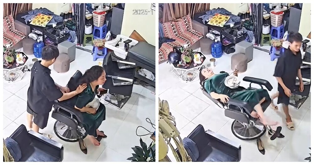В салоне парикмахер отрегулировал кресло женщины, чтобы она заняла удобное вертикальное положение для стрижки. Однако, когда клиентка попыталась немного сдвинуться, кресло неожиданно повернулось, и она потеряла равновесие.