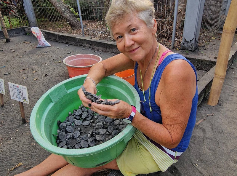 64-летняя Светлана Елкина влюбилась в этих животных после отпуска на Ко Талу. Она стала волонтером и побывала в Италии, Малайзии, Кении, Шри-Ланке и Таиланде, а затем остановилась в Индонезии. В числе прочего Светлана помогает новорожденным черепашатам добраться до воды, ухаживает за ранеными и дежурит ночью на пляжах, защищая кладки.
