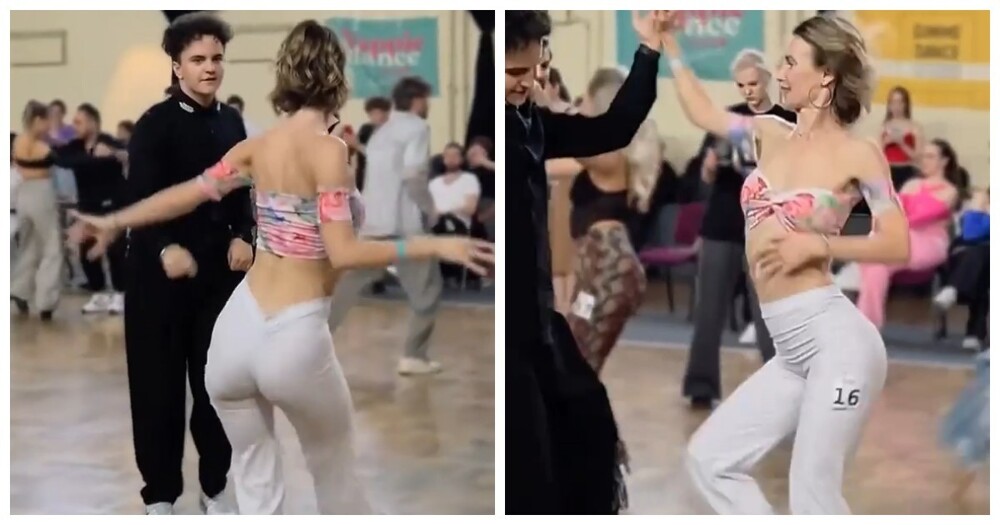 На видео запечатлена танцующая пара в зале, но всё внимание мгновенно приковывает девушка — её движения настолько пластичные и выразительные, что хочется смотреть без остановки.