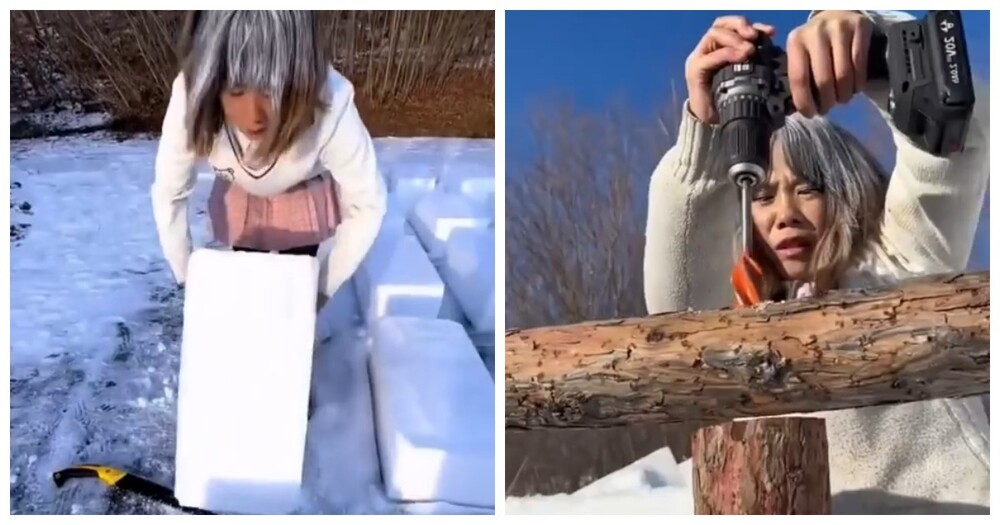 В Китае молодая девушка самостоятельно создала удивительную избушку из снега и льда. Она в одиночку таскала тяжёлые ледяные блоки и аккуратно складывала их, превращая холодный материал в сказочное сооружение.