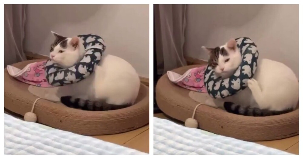 Кошка с защитным воротником, из которой получился бы идеальный загрузочный экран в какой-нибудь игре или программе. Надеюсь кто-то сделает окно загрузки с такой анимацией.