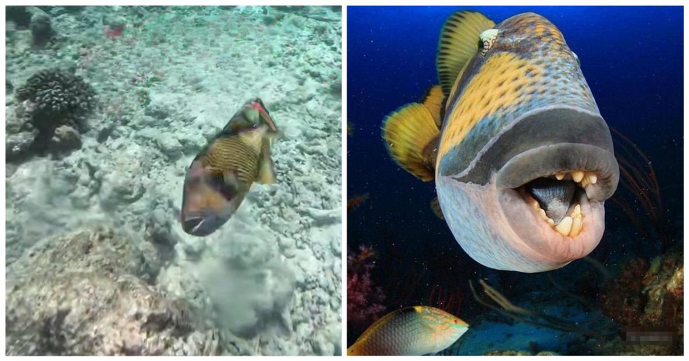 Рыба-триггер, она же голубоперый балистод атаковала дайвера на Мальдивах. Мужчина запечатлел приставучего агрессора.