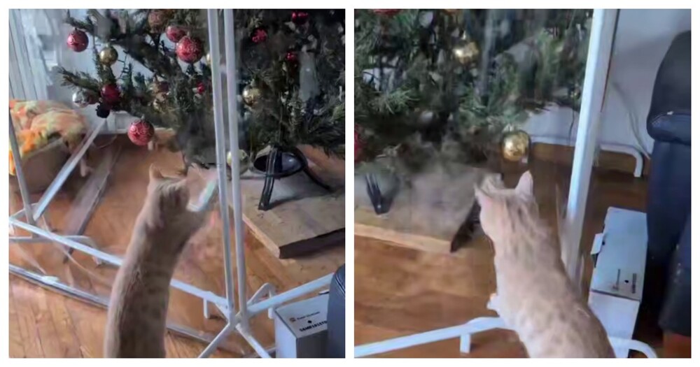 Совсем скоро многие поставят дома ёлку к новогодним праздникам. Питомцы само собой не оставят нарядную зеленую красавицу без внимания. Мужчина решил снять отзыв на новое защитное ограждение ёлки от домашних питомцев. Его кот поучаствовал в съемке.