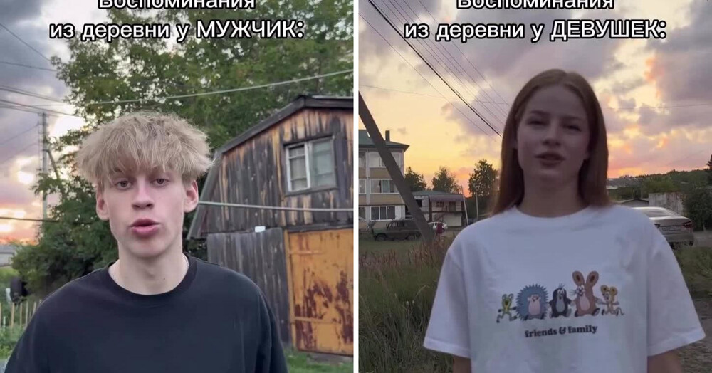 В ролике девушка и парень делятся своими детскими воспоминаниями о жизни в деревне — и контраст между их историями поражает. Для неё это время первых чувств, знакомства, первого поцелуя и спокойного света прошлого. Для него же — настоящий хаос: драки, синяки, переломы и бесконечные переделки.