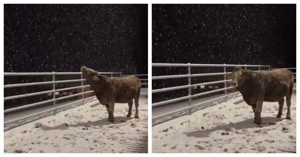 Корова впервые в жизни увидела снег. Она попыталась языком поймать снежинки.