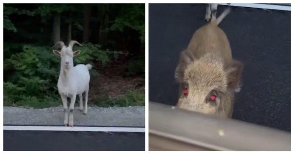 Польский автолюбитель встретил необычную парочку в лесистой местности. Сперва из леса вышел белый козёл, а следом за ним — кабан.
