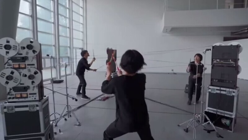 Музыканты из японской группы Open Reel Ensemble натянули магнитную ленту от катушечных магнитофонов на треугольную раму и сыграли на ней барабанными палочками.