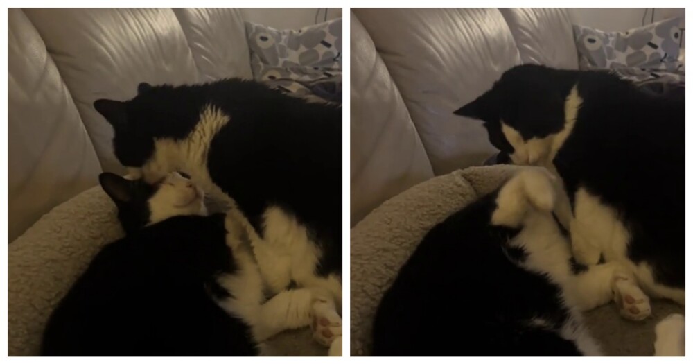 Хозяйка кошачьего семейства запечатлела милый момент. 20-летняя кошка ухаживала за своим 2-летним внуком.