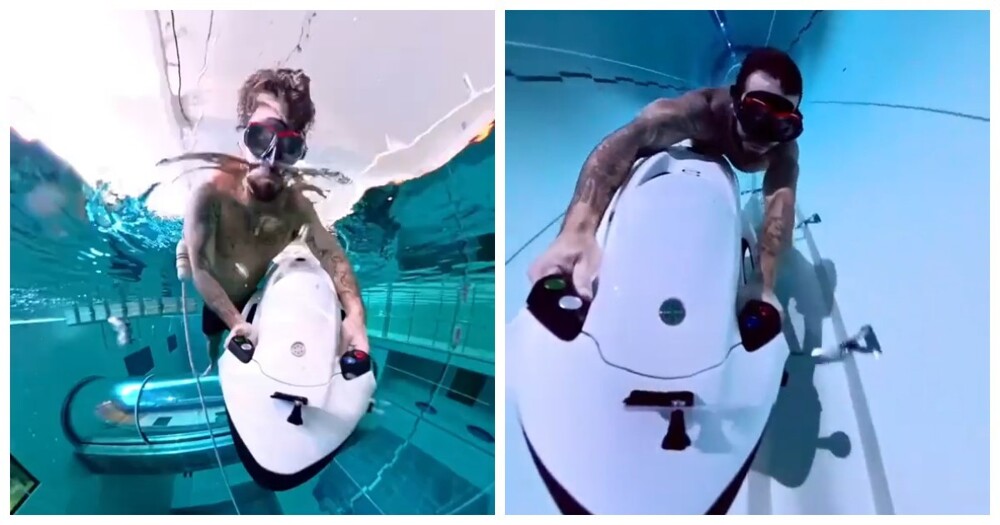 Пловец использует подводный скутер, чтобы всего за несколько секунд опуститься на глубину 40 метров в бассейне Y-40 The Deep Joy в Италии — самом глубоком термальном бассейне в мире. Благодаря прозрачной воде и стабильной температуре такое погружение выглядит практически как плавный полёт вниз.